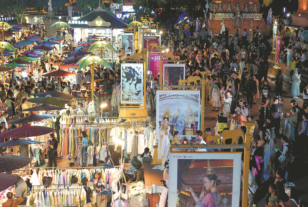 The Xingguang Night Market bustles with activity in Jinghong, Yunnan province, on Tuesday. LIANG ZHIQIANG/FOR CHINA DAILY