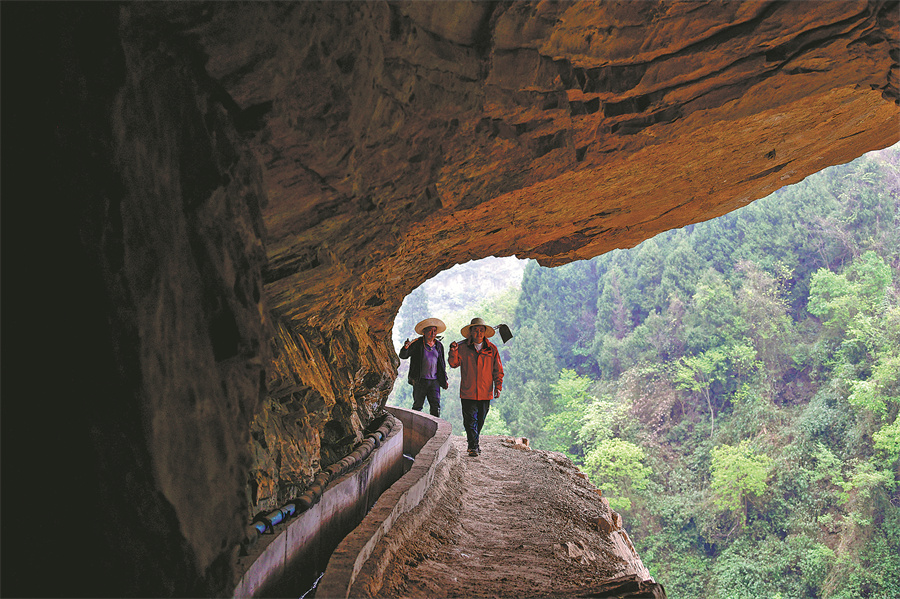On the precipitous cliffs, there are several canals that provide water for nearby farmlands in Shengji town, Bijie, Southwest China's Guizhou province. One of the daily tasks for canal maintenance team members is to clear leaves, branches and rocks.